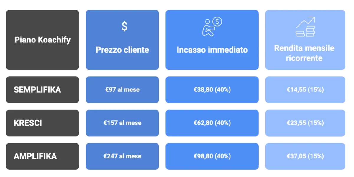 Falli iscrivere a Koachify col tuo link. Loro risparmiano, tu crei una rendita ricorrente per ogni cliente che gestisci.